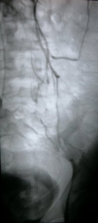 Bei dem 20 Jahre alten Mann fand sich eine Anorchie. Zur Abklärung wurde eine retrograde Venographie, ausgehend von einer Punktion der Vena femoralis (via Vena renalis sinistra) durchgeführt. Durch Sondierung und Kontrastmittelgabe konnten zwei filiforme Abgänge nach distal aus der Vena renalis sinistra dargestellt werden. Eine Sondierung zeigte multiple Gefäße, die sich bis in die Linea terminalis des Beckens verfolgen ließen. Vom Verlauf dieser Gefäße her ist anzunehmen, dass es sich bei einem davon um die linksseitige Vena testicularis handelt (Abbildung 1). Die Sondierung der rechten Testicularvene gelang nicht. Laparoskopisch konnten keine Hoden bzw. entsprechendes fibröses Gewebe gefunden werden. Auch bei einer Computertomographie des Abdomens und des Beckens fand sich kein Anhalt für Hodengewebe beiderseits.