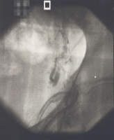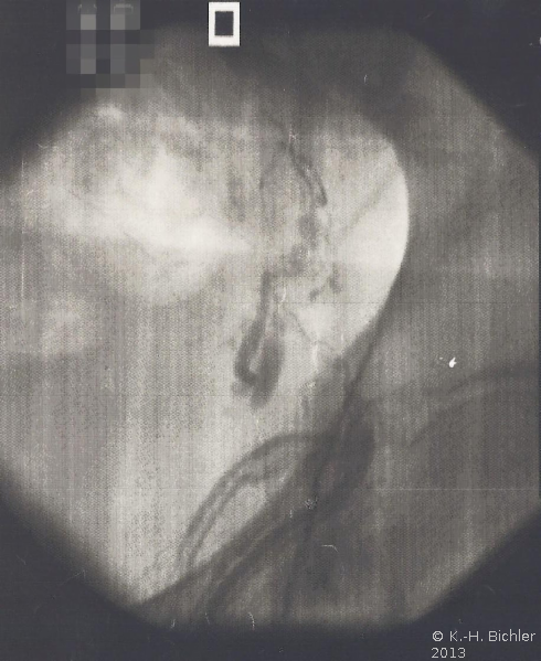 Phlebographie über eine Vene des Plexus pampiniformis. Nach Injektion von Kontrastmittel Darstellung mehrerer Kollateralen im Bereich der Beckengefäße, unter anderem zur Vena illiaca. Eine Sklerosierung wurde in Anbetracht der Kollateralen nicht durchgeführt (Abbildung HG1).
