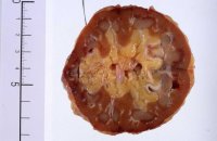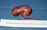 Bei der jungen Erwachsenen fand sich eine nahezu stumme Niere rechts bei Nierenarterienstenose links. Bei dem schwer einstellbaren Hypertonus wurde nach Stentimplantation in die rechte Nierenarterie die linksseitige Nephrektomie der kleinen Niere durchgeführt. Das Organ zeigte eine weitgehend glatte Oberfläche und auf der Schnittfläche einen schmalen Parenchymsaum sowie deutlich vermehrtes Hilusfettgewebe (Abbildung 24).