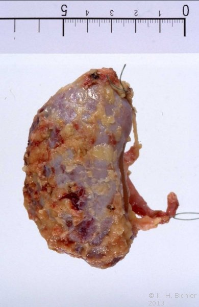 Aber wie auch in unserem Beispiel (s. Abbildung 21) zu erkennen, finden sich dabei häufig Veränderungen, die in die pyelonephritische Richtung gehen. Die pyelonephritische Schrumpfniere weißt deutliche Narben auf, die zum Teil bis in das Markgewebe reichen. Die Oberfläche ist großbucklig, das Parenchym zum Teil nur in Resten vorhanden und das Nierenbecken narbig verdickt. Das Hilusfettgewebe ist vermehrt ("Vakatwucherung") (Abbildung 23) (s. "Pyelonephritische Schrumpfniere").