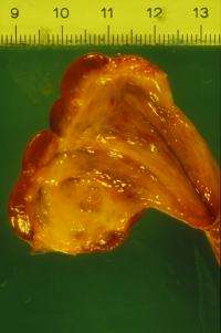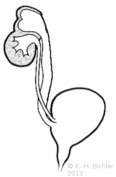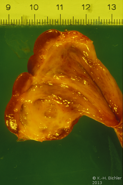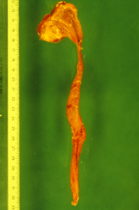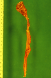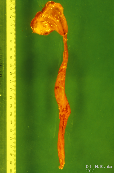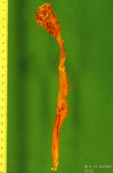 Bei einem ein Jahre alten Kind fanden sich rezidivierende, fieberhafte Harnwegsinfekte. Die Diagnostik ergab einen dysplastischen oberen Anteil der rechten Niere. Die Abbildung zeigt den entfernten dysplastichen Nierenanteil mit dem zugehörigen Harnleiter, der in eine Ureterozele mündet (Abbildung 9).
