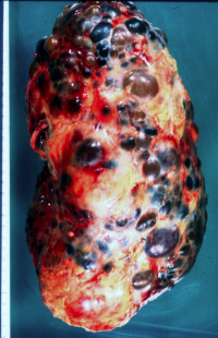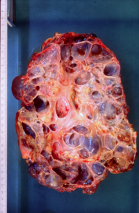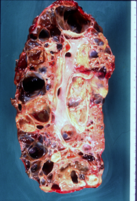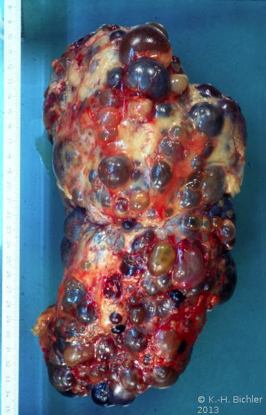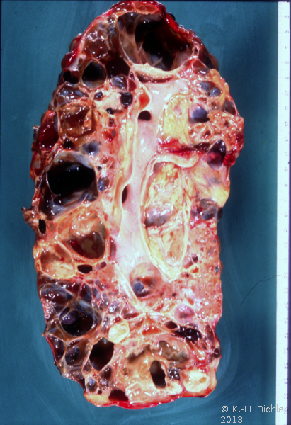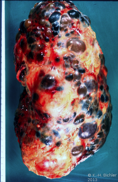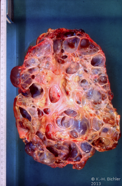 Im Vollbild der Erkrankung z.B. asymmetrische Nierenvergrößerung mit Zysten variabler Größe (wenige Millimeter bis mehrere Zentimeter). Es besteht ein nebeneinander von normalen und zystisch erweiterten Nephronen. Die Lokalisation der Zysten kann alle Nephronabschnitte betreffen. Die Nieren haben makroskopisch ein höckeriges Aussehen (Abbildung 3).