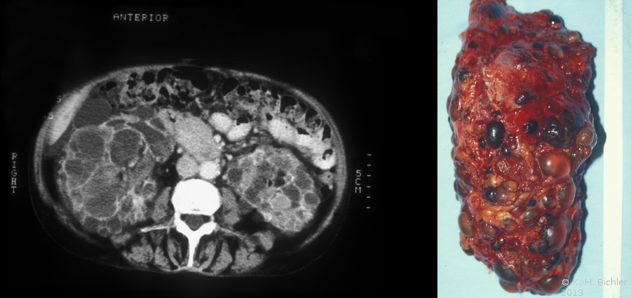 Die Diagnose wird mittels Anamnese (zystische Nierenerkrankungen in der Familie), RR-Messung, Labor (Kreatinin) mit genetischer Untersuchung, Sonographie, Computertomographie und gegebenfalls Kernspintomographie gestellt (Abbildung 4).
