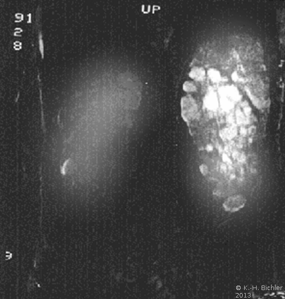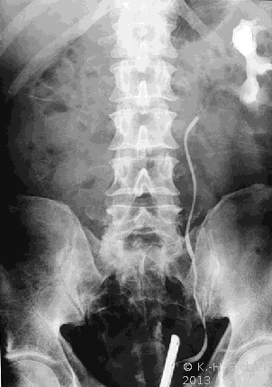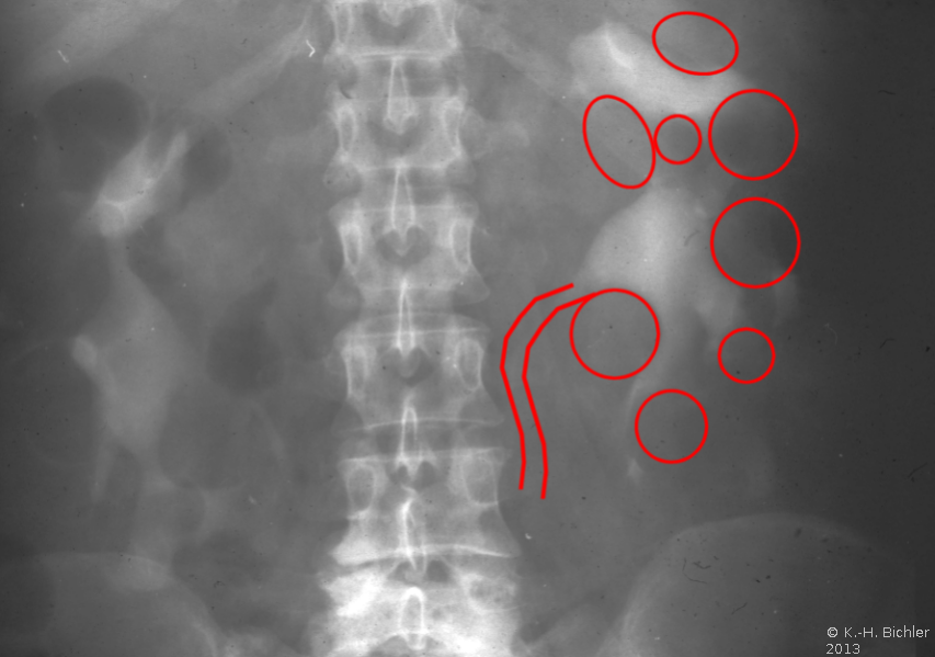 Ein i.v.-Pyelogramm kann im Rahmen der differentialdiagnostischen Abklärung des Flankenschmerzes indiziert sein (Abbildung). Sofern schon eine ausgeprägte Niereninsuffizienz vorliegt, sollte die Abklärung mit einem retrograden Pyelogramm erfolgen (Abbildung 5).