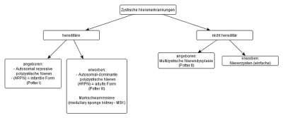 Das Krankheitsbild der doppelseitigen Zystennieren ist zwar eine Einheit, muss aber wegen der morphologischen Unterschiede und mit Rücksicht auf die Klinik in solche des Kindes- (ca. ¼) und Erwachsenenalters getrennt werden (Abbildung 2).